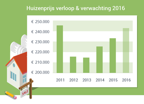 De huizenprijs stijgt door. Het aantal verkopen stijgt al sinds het voorjaar van 2013 terwijl de échte prijsstijging pas in de winter erna inzette. Die prijsstijging gaat een inhaalslag maken. Onze verwachting voor 2016 is dat de huizenprijzen met minimaal 4% zullen stijgen.