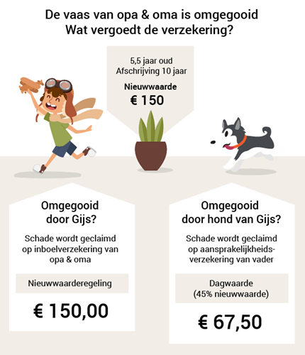 Die bepaling geldt ook voor de vaas van opa en oma. Als het namelijk niet de door hen toegelaten hond was, maar hun kleinkind die de vaas omstootte, dan hadden ze de schade op hun (allrisk-) inboedelverzekering kunnen claimen. Dat scheelt nogal in de uitkering.