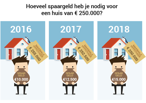 Om een huis te kopen heb je dus steeds meer eigen geld nodig. Doorgaans kun je rekenen op 6% aan bijkomende kosten, bij de koop van een huis. Vorig jaar kon je nog maximaal 103% van de koopsom lenen. Dit jaar is dat maximaal 102%. In 2017 gaat er opnieuw een procent van af en per 2018 kun je nog maximaal 100% van de woningwaarde lenen.