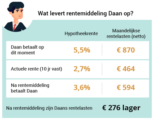 - Daan betaalt op dit moment 5,5% hypotheekrente. Zijn rentevaste periode loopt nog drie jaar