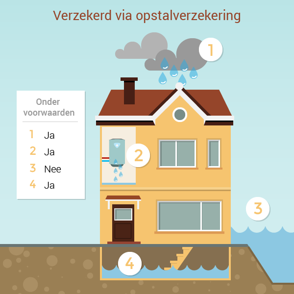 Een rivier overstroomt. Of een gemaal in de buurt is stil komen te vallen. De omliggende straten lopen vol water. Zandzakken worden aangerukt maar kunnen niet voorkomen dat enkele huizen vol water komen te staan. In dit geval keert een verzekeraar niet uit. Dekking tegen overstromingen vormen geen onderdeel van de dekking.