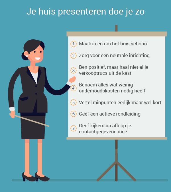 Als verkoper ben je uiteraard positief over het huis waar je vanaf wilt. Overstelp de kijkers niet meteen met al je verkooptrucs. Zo is het niet nodig om bij iedere ruimte alle voordelen meerdere keren te benadrukken. Dit komt al snel opdringerig over en blijft bij de kijker toch niet hangen. Vertel liever waarom je er altijd met veel plezier hebt gewoond, maar waarom je nu toch gaat verhuizen.Â