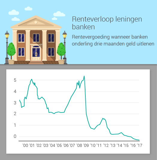 Als banken geld aan elkaar uitlenen, krijgen ze daar geen rentevergoeding over. Sterker nog, een bank moet zelfs betalen voor het parkeren van geld bij een andere bank. Dit is één van de redenen dat de spaarrente die jij ontvang bijzonder laag is. Een bank geeft jouw geen hogere rente nu het lastiger is om er winst op te maken door het weer uit te lenen.
