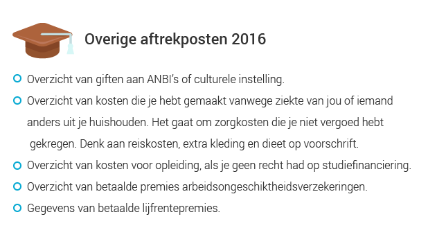De gegevens rondom je inkomsten, hypotheek en bankrekening staan vooraf ingevuld. Aftrekposten moet je zelf invullen. De voorwaarden vind je op de website van de Belastingdienst. Dit heb je mogelijk aan gegevens nodig: