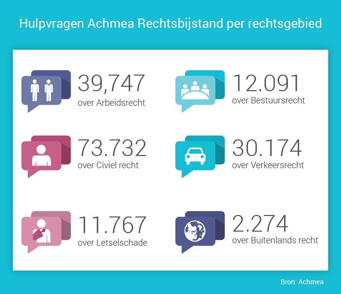 Steeds meer mensen weten een rechtsbijstandverzekeraar te vinden. In 2016 waren er alleen al bij Achmea Rechtsbijstand bijna 170.000 hulpvragen. Ruim 3.000 meer dan een jaar eerder. Vooral ontslag, ziekteverlof en burenruzies waren redenen om hulp te vragen. Verder was het ook druk rond aankopen via internet. Bijvoorbeeld om na annulering van een aankoop het aankoopbedrag terug te krijgen.
