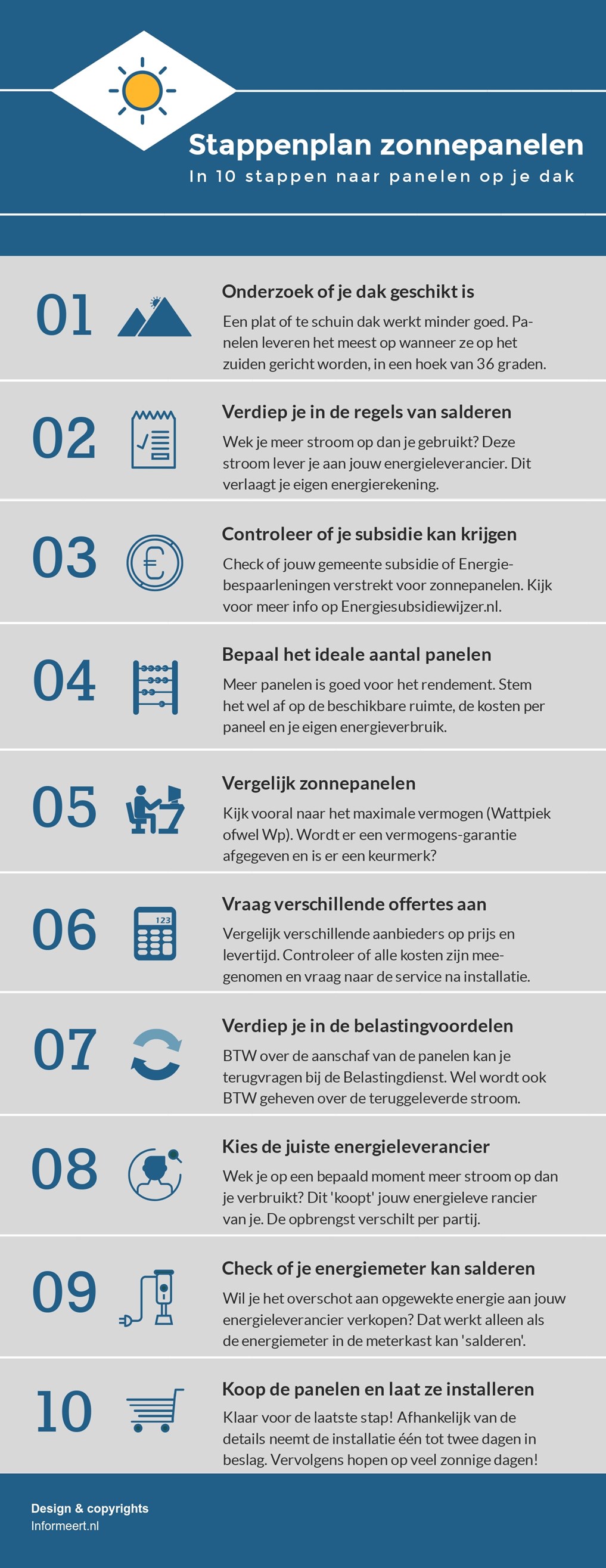 Het opwekken van stroom met zon, water of wind is niet het specialisme van Evercare Nieuws. Vraag ons dan ook niet welk soort paneel jij het best op je dak kan leggen of wat de exacte opbrengst is van een bepaald type. Wel helpen we je graag op weg met de onderstaande infographic. Met het stappenplan bepaal je of de installatie van zonnepanelen iets voor jou is en hoe het aan te pakken.