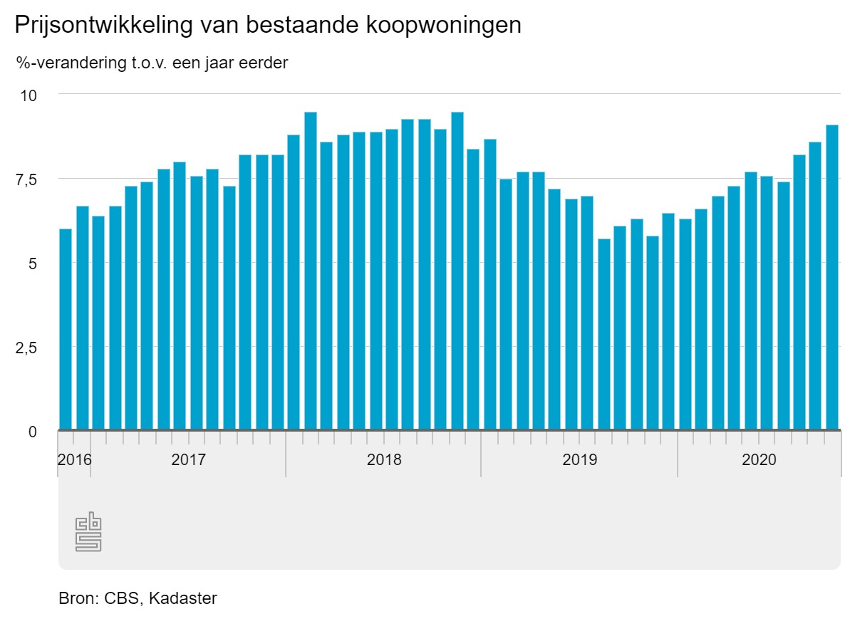 In juni 2013 bereikte de prijzen van koopwoningen een dieptepunt. Sindsdien is er sprake van een stijgende trend. In 2019 zwakte de stijging tijdelijk wat af, maar daarna stegen de prijzen weer wat sneller. In oktober 2020 lag de index op het hoogste niveau ooit. Vergeleken met het dal in juni 2013 lagen de prijzen in oktober maar liefst 54 procent hoger.