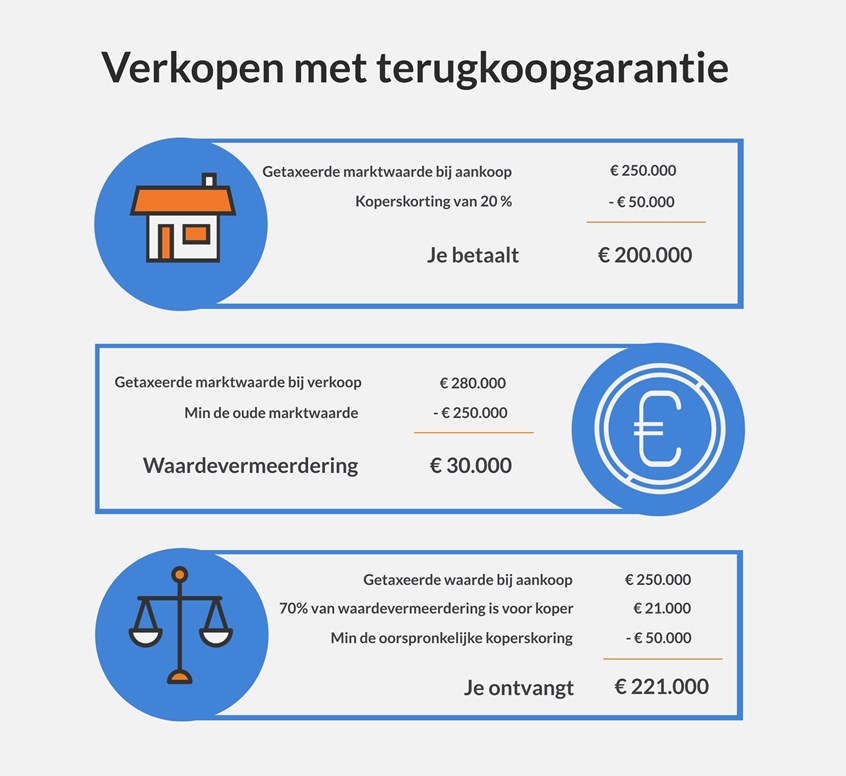 In bovenstaande illustratie is uitgegaan van winst. In een neergaande markt kan het ook zijn dat de woning minder waard wordt. Stel de waardevermindering is €50.000, in die situatie komt 70 procent van het verlies voor jouw rekening (€35.000). De terugverkoopprijs is dan €165.000. Verkopen onder voorwaarden remt je verlies, je hoeft dit immers niet helemaal zelf te dragen. Hier staat wel tegenover dat je de winst ook deelt.Â