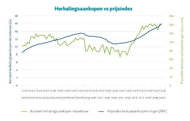 De bouw van nieuwe woningen kan de vraag ernaar niet bijhouden. Het aanbod per koper is hierdoor beperkt, waardoor de prijs stijgt. Eigenaren die eerder nieuwbouw kochten, profiteren van de prijsstijging en hebben een bovengemiddelde overwaarde. Deze overwaarde kunnen ze vervolgens weer inzetten bij het kopen van de volgende nieuwbouwwoning.Â