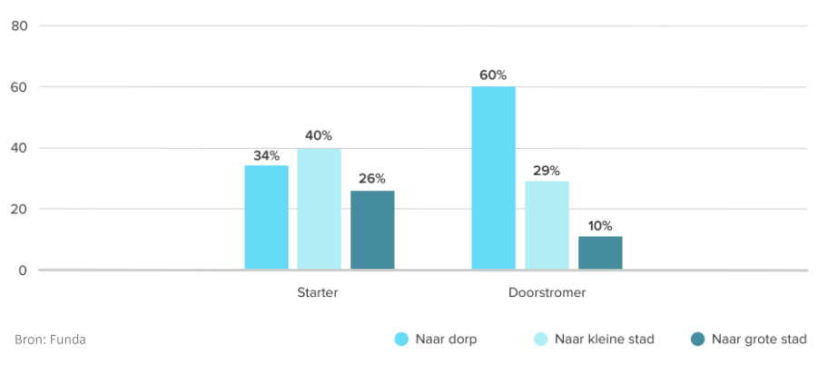 Met name doorstromers verhuizen liever naar een dorp dan naar een stad. Starters geven eerder de voorkeur aan een kleine stad (40%). Beide groepen zijn het minst enthousiast over verhuizen naar een grote stad.