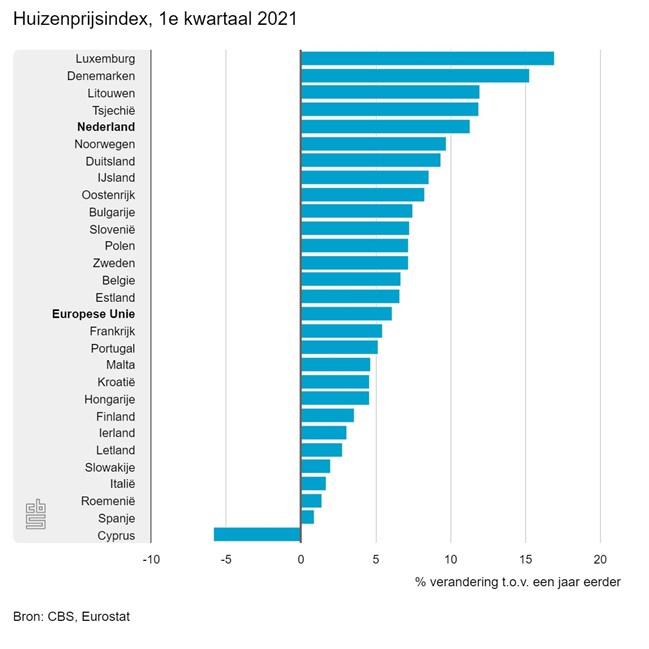 Aanvoerder op de lijst is Luxemburg, met een gemiddelde prijsstijging van 17%. Ook in Denemarken, Litouwen en Tsjechië zijn de prijzen harder gestegen dan hier. Binnen de Europese Unie werd een huis alleen in Cyprus goedkoper.