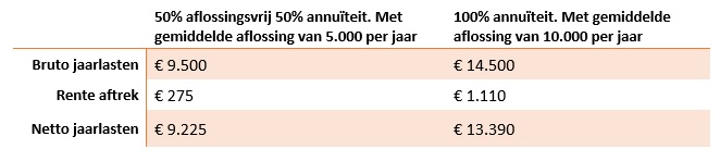 Het verschil in maandlasten is aanzienlijk, bijna €350. Dit is een versimpeld voorbeeld. In de praktijk zal het verschil kleiner zijn omdat er meer factoren meespelen. Bij een deels aflossingsvrije hypotheek kun je bijvoorbeeld geen gebruik maken van Nationale Hypotheek Garantie. Hierdoor krijg je in veel gevallen te maken met een nipt hogere hypotheekrente, wat het verschil in netto maandlasten remt.