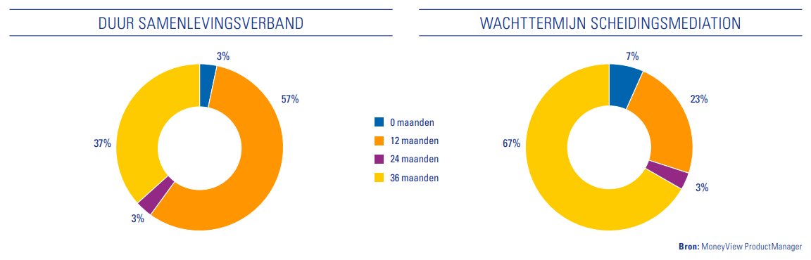 Scheidingsmediation wordt bij de meeste verzekeringen geboden als je minimaal een bepaald aantal jaar bent getrouwd of geregistreerd partner bent. Bij de meeste aanbieders (57%) kom je in aanmerking voor mediation als je minimaal één jaar samen bent. Let op: doorgaans wordt alleen hulp geboden bij huwelijk of geregistreerd partnerschap. Bij slechts 28% van de verzekeraars wordt hulp geboden bij beëindiging van een samenlevingscontract.