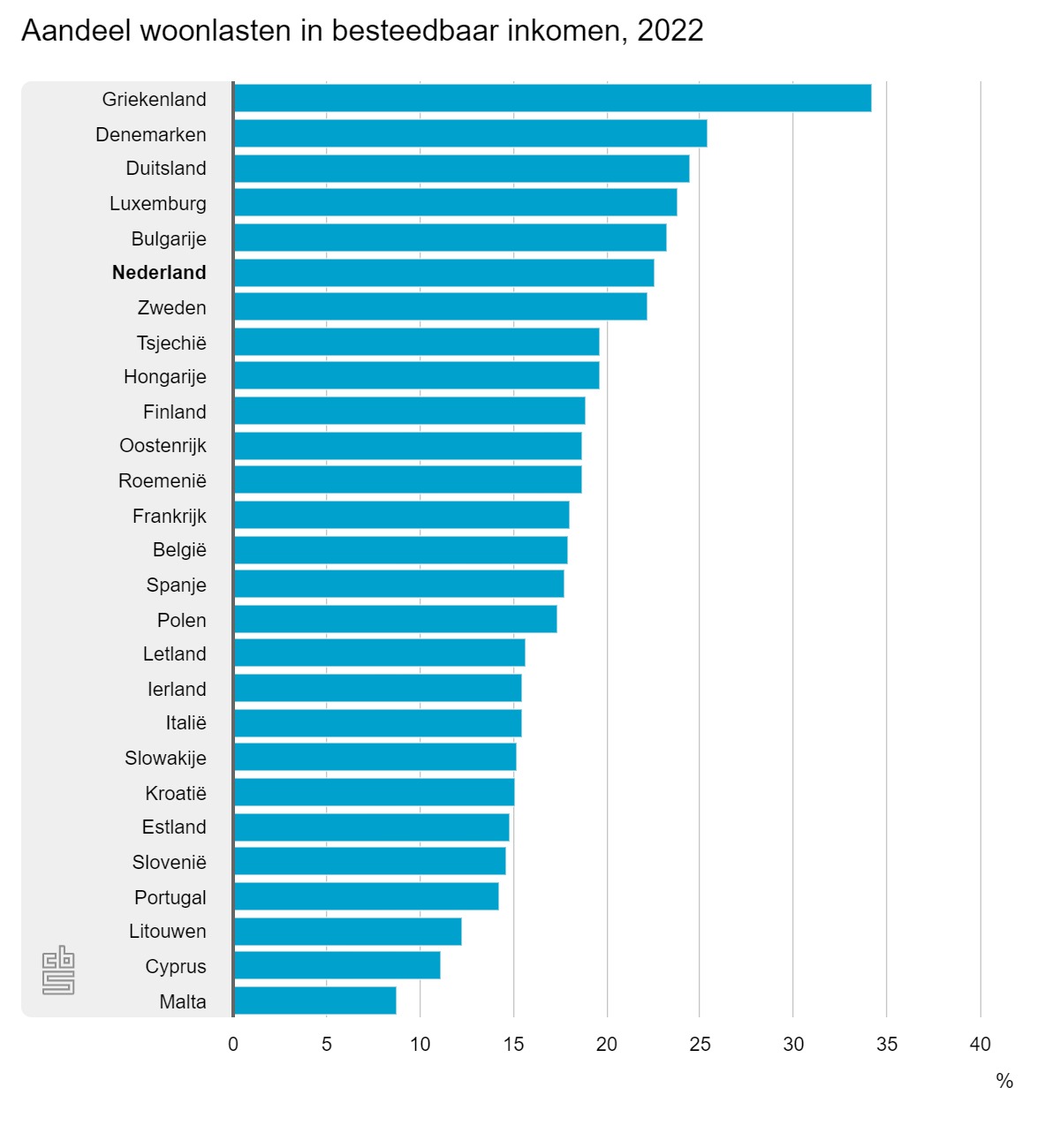 Nederlanders besteden gemiddeld 23 procent van hun besteedbaar inkomen aan woonlasten. Dit plaatst Nederland op de zesde plaats binnen de Europese Unie. In 2023 waren de huurprijzen in Nederland 18,5 procent hoger dan in 2015, waarmee Nederland zich in de middenmoot bevindt van Europese huurprijsstijgingen. Deze informatie is afkomstig van het CBS, dat woonlasten in de EU heeft vergeleken.